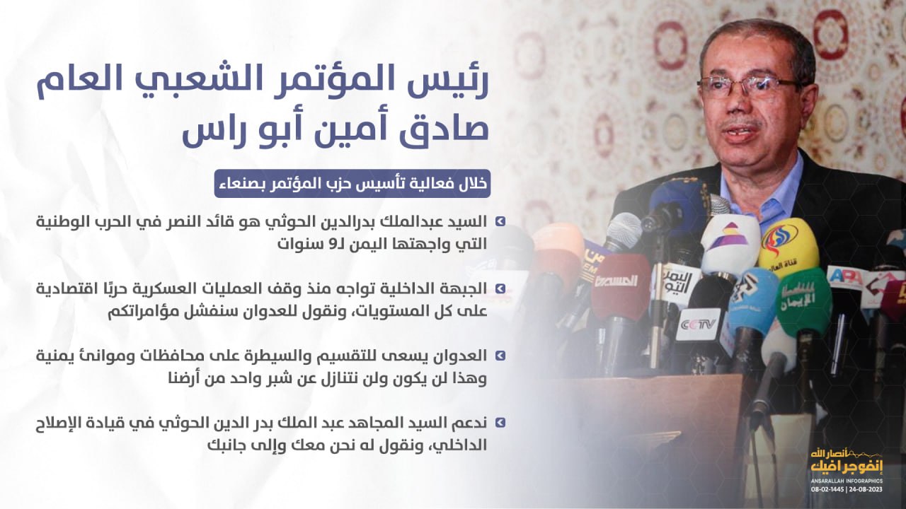 أكد رئيس المؤتمر الشعبي العام صادق أمين أبو راس، أن السيد عبدالملك بدرالدين الحوثي هو قائد النصر في الحرب الوطنية التي واجهتها اليمن لـ9 سنوات.
