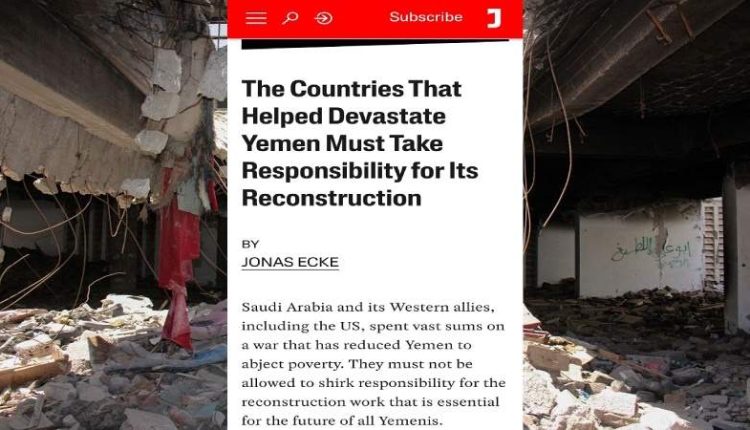 تقرير مجلة جاكوبين أكد أنه يجب على دول الاتحاد الأوروبي، باعتبارها موردي الأسلحة الرئيسيين للتحالف الخليجي، أن تساهم أيضا في إعادة الإعمار في اليمن.. حيث زادت صادرات الاتحاد الأوروبي، وخاصة من المملكة المتحدة وألمانيا وفرنسا، إلى السعودية والإمارات بشكل ملحوظ خلال الحرب.