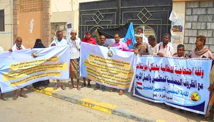 ونفذ معلمو مدارس لحج وقفات احتجاجية متفرقة، تنديدا بعدم تسليم مرتباتهم وتحويلها إلى البنوك والمصارف.