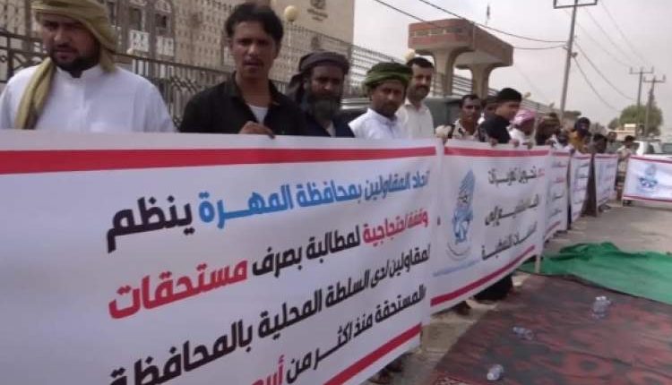 وتظاهر العشرات من اتحاد مقاولي المهرة، أمام بوابة فرع البنك المركزي في مدينة الغيضة، وسط المحافظة، للمطالبة بمستحقاتهم المالية المتوقفة منذ 4 سنوات، ما اضطر قيادة البنك لإغلاق المبنى.