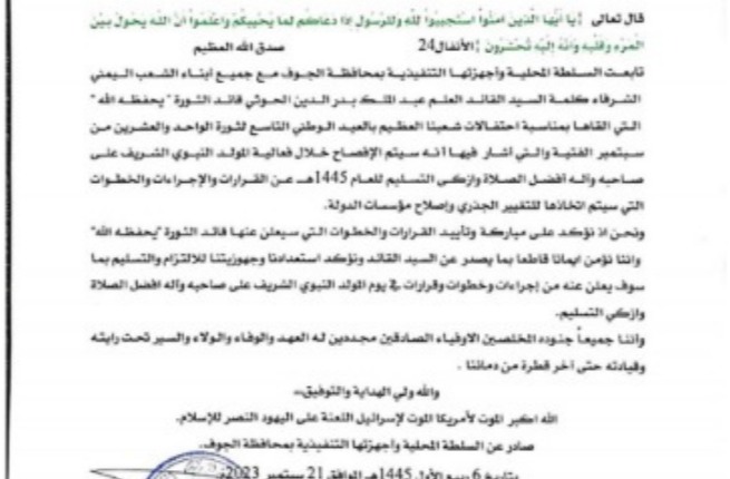 وأكدت السلطة المحلية في بيان لها، التأييد والتسليم لقرارات قائد الثورة، التي سيعلن عنها يوم المولد النبوي الشريف، بهدف إصلاح مؤسسات الدولة والنهوض بمستواها لتلبية تطلعات الشعب اليمني.