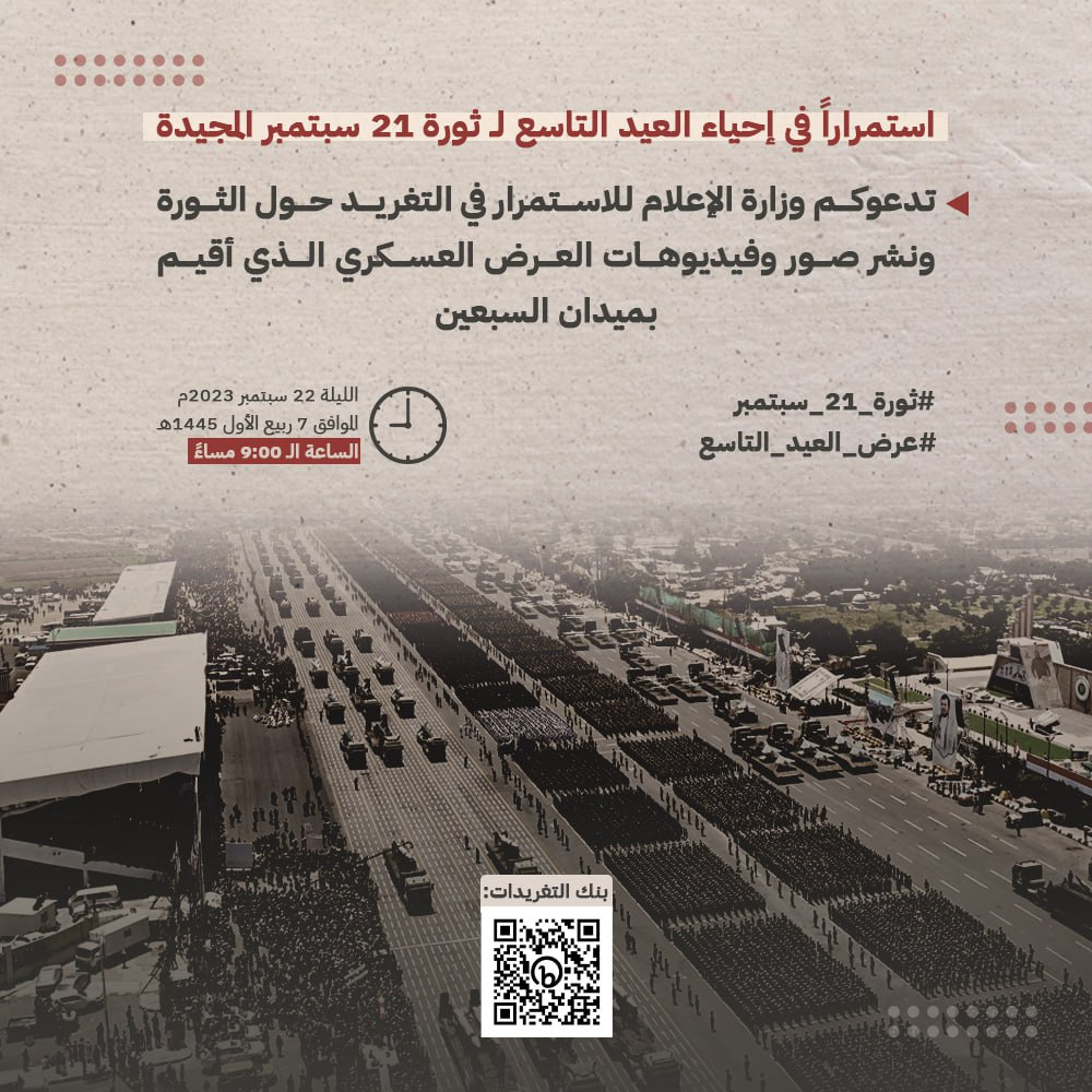 ودعت وزارة الإعلام الجميع للمشاركة في حملة التغريدات التي تأتي استمرارا لإحياء العيد التاسع لثورة الحادي والعشرين من سبتمبر من خلال نشر صور وفيديوهات العرض العسكري الذي أقيم بميدان السبعين على الهاشتاقين: