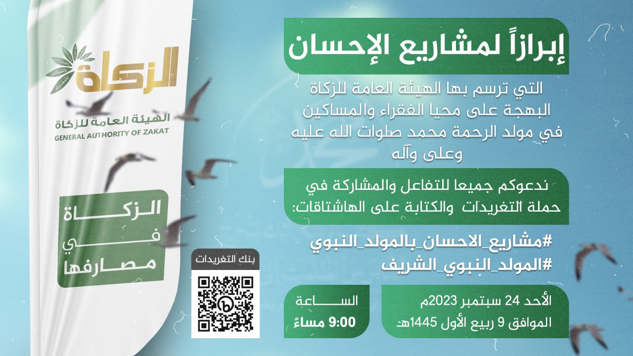 تنطلق في تمام الساعة التاسعة من مساء اليوم، حملة تغريدات واسعة على منصة “إكس”، تتويجاً لمشاريع الإحسان التي دشنتها الهيئة العامة للزكاة، بمناسبة ذكرى المولد النبوي الشريف.