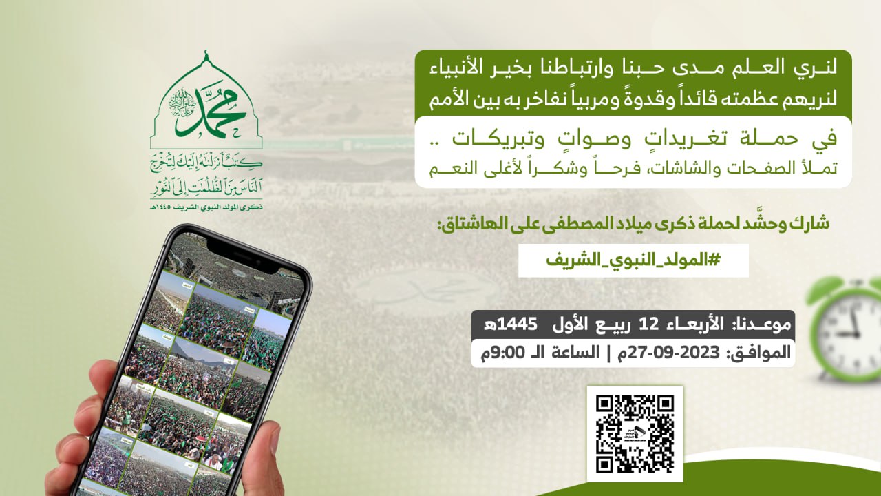 تزامناً مع ذكرى المولد النبوي الشريف واحتفالات شعبنا اليمني في أمانة العاصمة والمحافظات اليمنية بهذه الذكرى العظيمة، تنطلق في تمام الساعة التاسعة من مساء اليوم الأربعاء حملة تغريدات واسعة على منصة “إكس”.