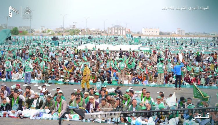 حيث احتشدت الجماهير من مختلف مديريات محافظتي تعز ولحج، رافعة المصحف الشريف والشعارات والرايات الخضراء والصدح بالمدح المحمدي وترديد الهتافات المؤكدة تمسك أبناء المحافظة بالنبي الخاتم.