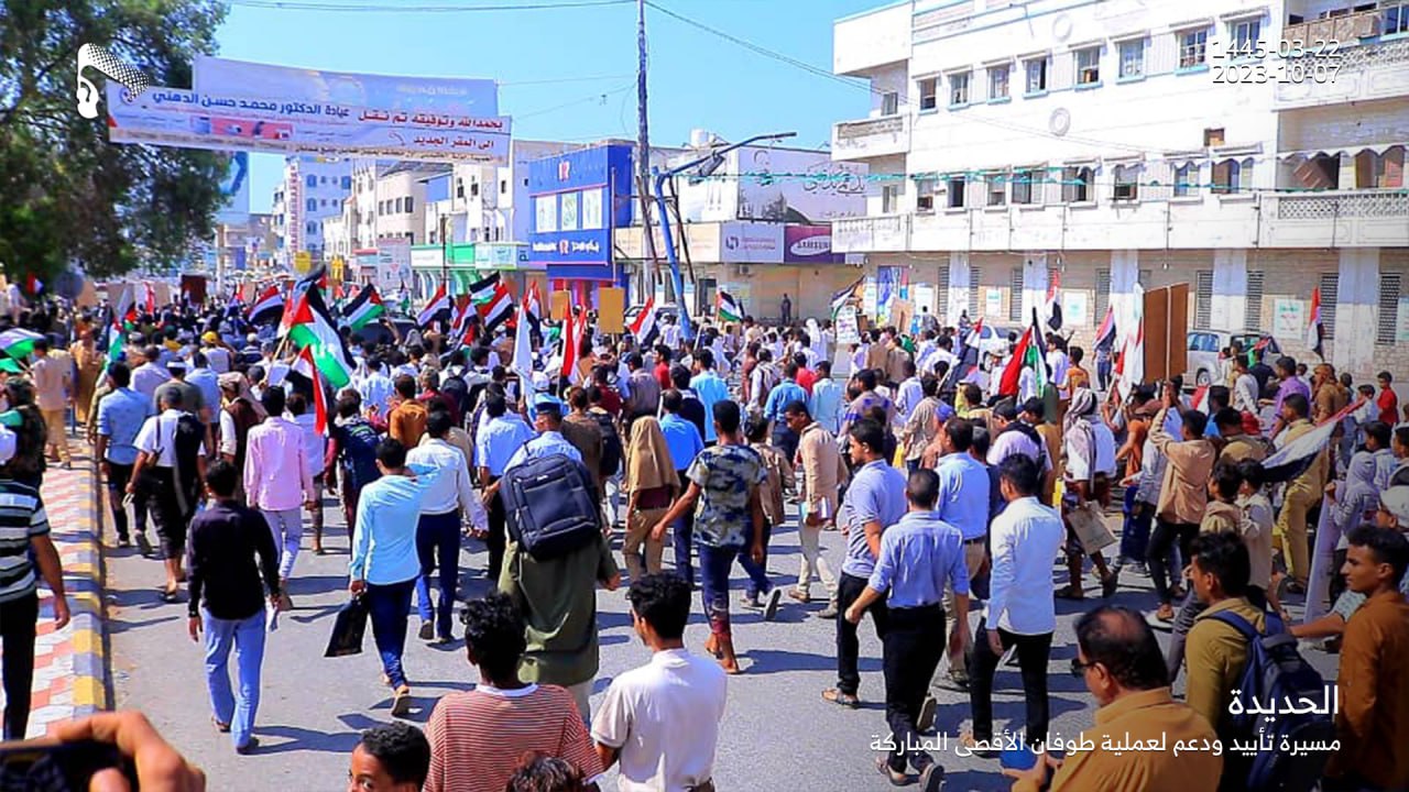 وأكد أن خروج أبناء الحديدة في هذه المسيرة، يأتي في إطار تعزيز موقف اليمن الثابت والمبدئي تجاه القضية الفلسطينية ونصرة الشعب الفلسطيني حتى استعادة كامل أراضيه وإقامة دولته المستقلة على كامل ترابه وعاصمتها القدس الشريف.