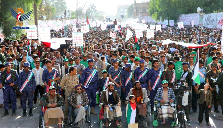 وفي المسيرة التي تقدمها المحافظ محمد البخيتي ووكلاء المحافظة وعدد من أعضاء مجلس الشورى ومديرو المكاتب التنفيذية وممثلو مختلف شرائح المجتمع، بارك أبناء ذمار العملية البطولية النوعية التي نفذها أبطال المقاومة وما حققته من انتصارات تمثل نقطة تحول مهمة في مسار مقاومة الكيان الصهيوني المحتل.