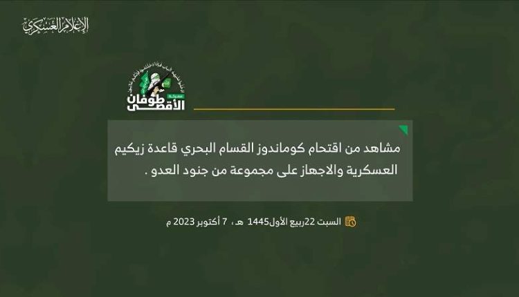ما سمح بنشره من مشاهد اقتحام الكوماندوز البحري في كتائب القسام لقاعدة “زيكيم” العسكرية عبر البحر في اللحظات الأولى لمعركة طوفان الأقصى وإجهازهم على عددٍ كبير من الجنود داخل القاعدة