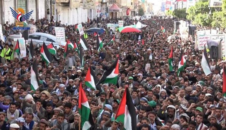ورفع المحتشدون في المسيرة العلمين الفلسطيني واليمني.. مرددين الشعارات المؤكدة على الوقوف إلى جانب الشعب الفلسطيني ومقاومته الباسلة في مواجهة الكيان الصهيوني الغاصب.