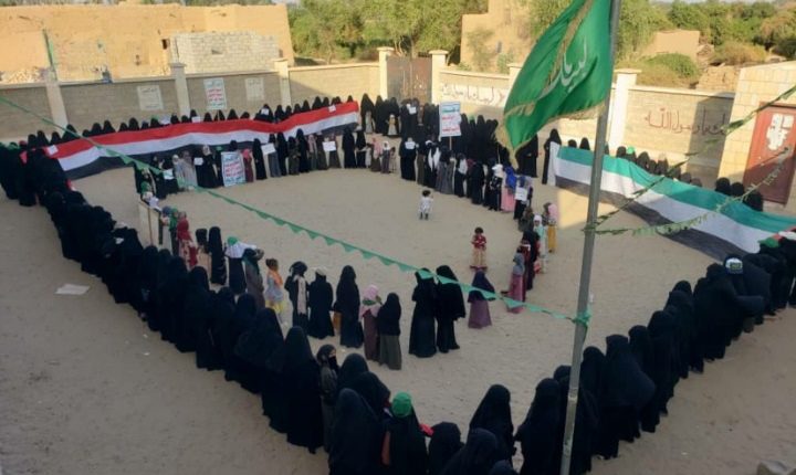 نظمت الهيئة النسائية في مديريتي المتون وبرط المراشي بمحافظة الجوف، اليوم، وقفتين تأييدا لعملية “طوفان الأقصى”، التي نفذها أبطال المقاومة الفلسطينية ضد العدو الصهيوني الغاصب.
