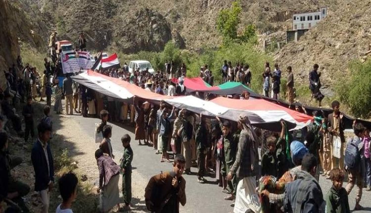 ورفع طلاب المدارس، العلمين الفلسطيني واليمني، مرددين الشعارات المؤكدة الوقوف إلى جانب الشعب الفلسطيني ومقاومته الباسلة في مواجهة الكيان الصهيوني الغاصب.