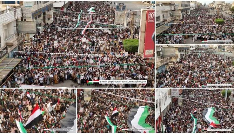 ورفعوا الرايات والعلم الفلسطيني، تعبيراً عن موقف الشعب اليمني الثابت والمبدئي تجاه قضية فلسطين، مؤكدين دعم فصائل المقاومة لمواصلة ردع العدو الصهيوني والوقوف إلى جانب الشعب الفلسطيني حتى تحرير أراضيه المحتلة واستعادة كامل حقوقه المسلوبة.