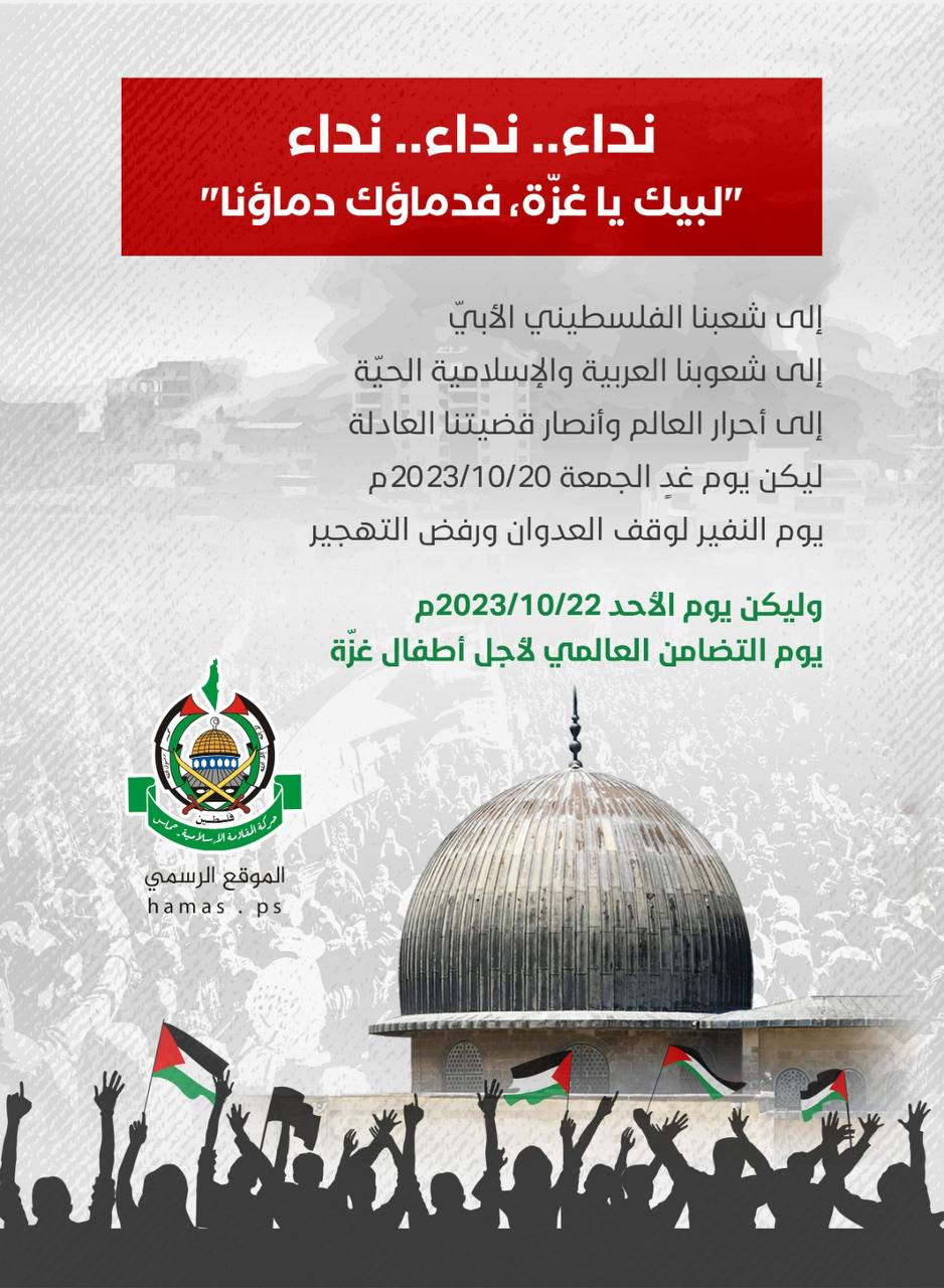 دعت حركة “حماس” الفلسطينية الشعب الفلسطيني والشعوب العربية والإسلامية وأحرار العالم وأنصار قضيَّتنا العادلة إلى النفير، يوم غد الجمعة 20 أكتوبر، وإلى جعل يوم الأحد يومًا للتضامن العالمي لأجل أطفال غزة. وذلك في ظل “حرب الإبادة الجماعية والمجازر المروّعة التي يرتكبها العدو الإسرائيلي وحكومته الفاشية ضدّ أبناء شعبنا الفلسطيني، المدنيين العزَّل في قطاع غزّة”.