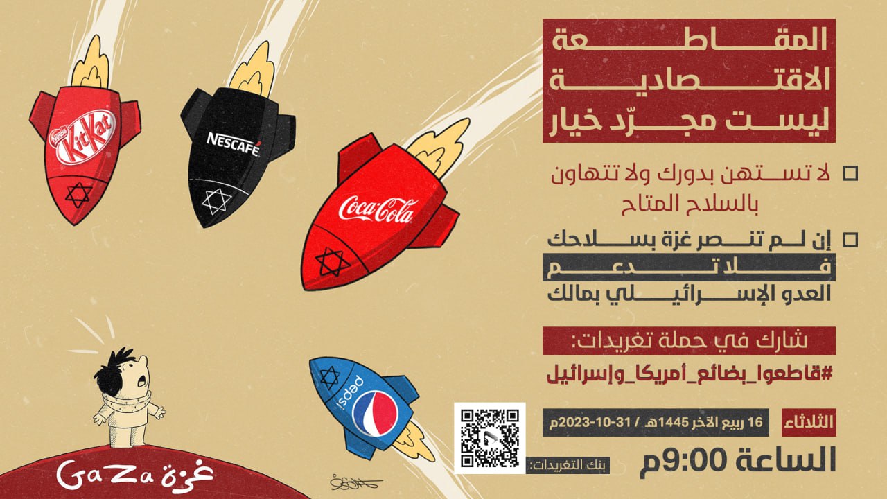 ودعا المنظمون إلى أهمية المشاركة الواسعة في الحملة لإبراز أهمية المقاطعة للبضائع الأمريكية الإسرائيلية كسلاح متاح وفعّال من أجل نصرة غزة، تحت شعار” إن لم تنصر غزة بسلاحك فلا تدعم العدو الإسرائيلي بمالك” وذلك على الهاشتاق: