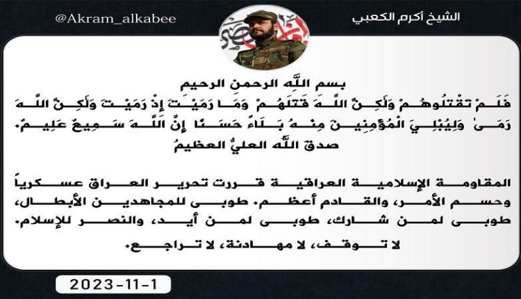 كشف الأمين العام لحركة النجباء العراقية الشيخ أكرم الكعبي أن المقاومة الإسلامية العراقية قررت تحرير العراق عسكرياً من الوجود العسكري الأجنبي.