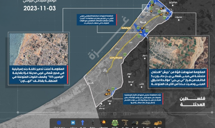 يُشار إلى أنّ الاحتلال شنّ، الجمعة، غاراتٍ جوية عنيفة على مناطق حي النصر والكرامة في شمالي غربي مدينة غزّة، وذلك بالتزامن مع محاولات التقدم التي لاقت مقاومة شديدة، كما قصفت مدفعية الاحتلال بشكلٍ مكثّف في المناطق الشرقية لخان يونس جنوبي القطاع، تزامناً مع خوض المقاومة اشتباكاتٍ عنيفة مع آليات الاحتلال التي حاولت التقدم من دون تثبيت أي مناطق تمركز.