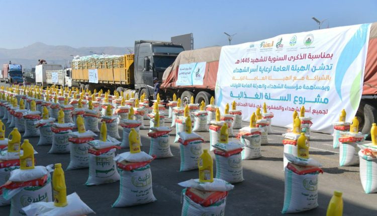 دشنت الهيئة العامة لرعاية أسر الشهداء بالشراكة مع الهيئة العامة للزكاة وبمساهمة من مؤسسة الشهداء والهيئة العامة للأوقاف، اليوم مشروع السلة الغذائية لجميع أسر الشهداء والمفقودين في كافة المحافظات بمناسبة الذكرى السنوية للشهيد 1445هـ.