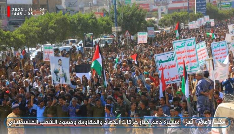 مسيرة جماهيرية حاشدة في تعز تأييداً لخيارات فصائل الجهاد والمقاومة ودعماً لصمود الشعب الفلسطيني
