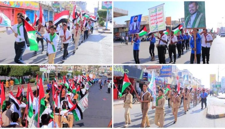ورفع الطلاب المشاركون في المسيرة ،التي جابت عددا من شوارع المديرية وصولا إلى أمام مبنى مجمع المحافظة، الأعلام الفلسطينية ورايات التضامن مع الأشقاء الفلسطينيين، مرددين الهتافات المنددة بمواقف قادة الأنظمة العربية وتأمرهم على القضية الفلسطينية.