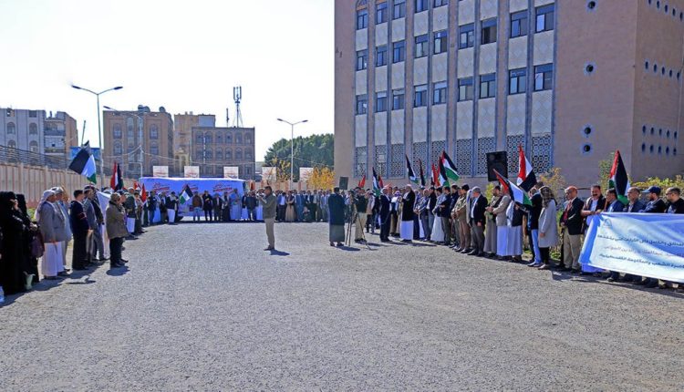 وخلال الوقفة أكد نائب وزير الصناعة والتجارة أحمد الشوتري، أن الوقفة التضامنية لموظفي الوزارة تأتي ضمن الموقف اليمني الشجاع والمشرف مع أبناء الشعب الفلسطيني الصامد في وجه الصلف والإجرام الصهيوني.