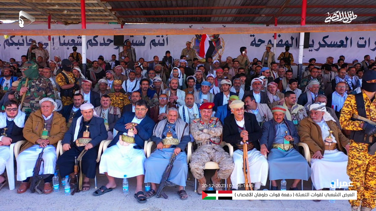 وبعد الاستئذان ببدء العرض الذي حضره عضو المجلس السياسي الأعلى محمد علي الحوثي، سار الخريجون من أمام منصة العرض، حاملين سلاحهم والعلم اليمني والفلسطيني وشعارات الحرية والنصرة للشعب الفلسطيني.