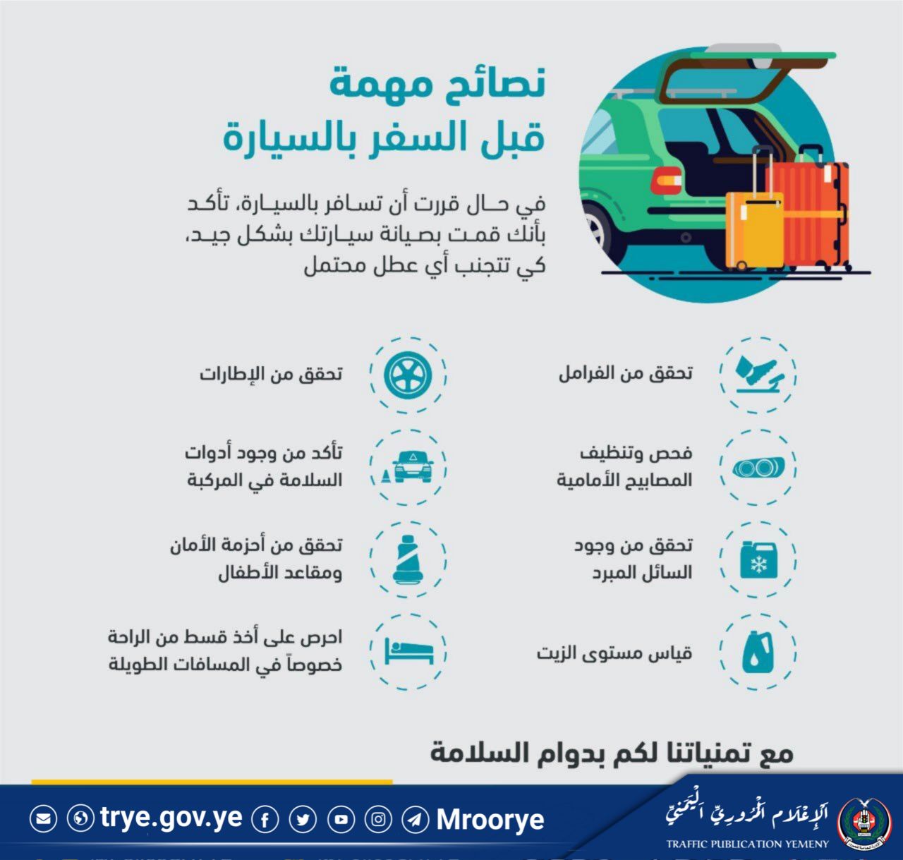 منوعات أخي السائق.. تعرف على أهم النصائح التي يجب عليك اتباعها قبل السفر بالسيارة أخي السائق.. تعرف على أهم النصائح التي يجب عليك اتباعها قبل السفر بالسيارة #ولا_تمش_في_الأرض_مرحا #الادارة_العامة_للمرور #الإعلام_المروري_اليمني # حملة التوعية المرورية#ولا تمش في الأرض مرحاالإدارة العامة للمرور Share