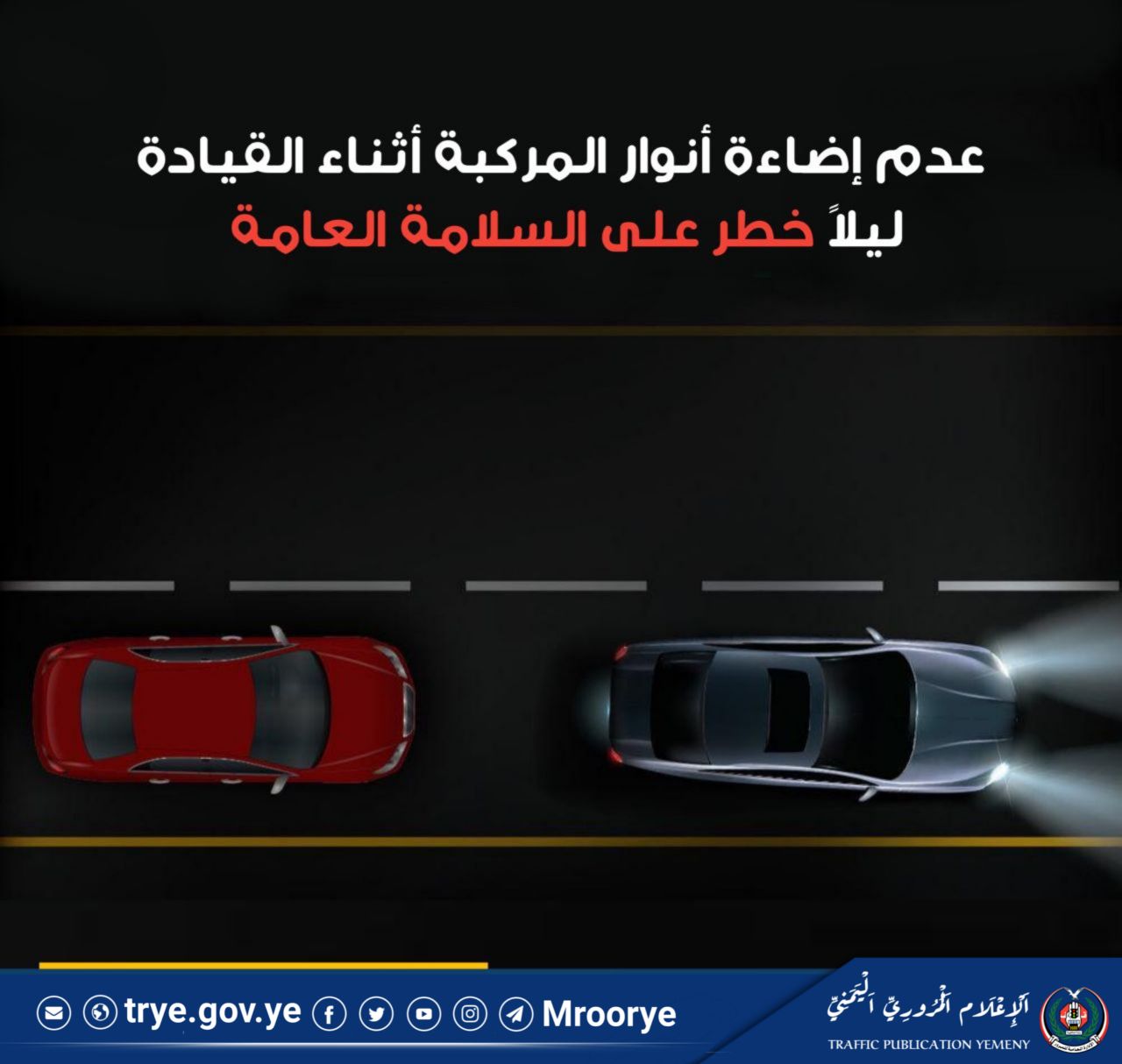 منوعات أخي السائق.. عدم إضاءة أنوار المركبة أثناء القيادة ليلاً خطر على السلامة العامة أخي السائق.. عدم إضاءة أنوار المركبة أثناء القيادة ليلاً خطر على السلامة العامة #ولا_تمش_في_الأرض_مرحا #الادارة_العامة_للمرور #الإعلام_المروري_اليمني # حملة التوعية المرورية#ولا تمش في الأرض مرحاالإدارة العامة للمرور Share