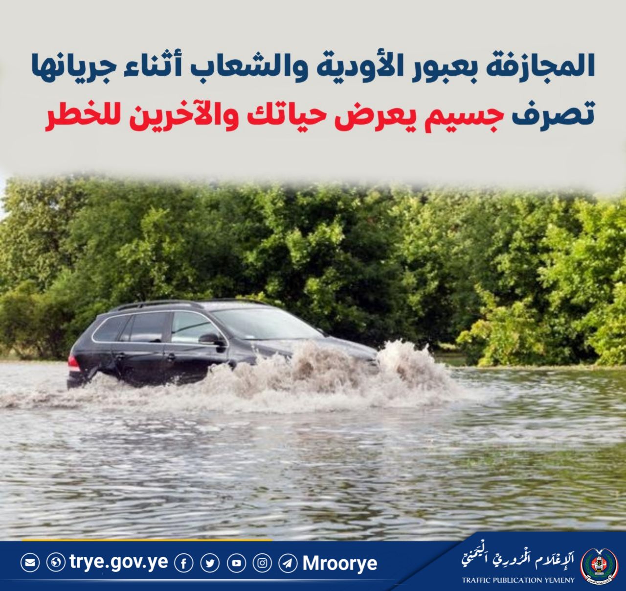 أخي السائق.. المجازفة بعبور الأودية والشعاب أثناء جريانها تصرف جسيم يعرض حياتك والآخرين للخطر