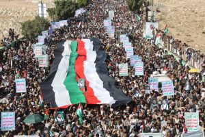 وحمل المشاركون في المسيرة الأعلام اليمنية والفلسطينية وصورا لشهداء القوات البحرية ورايات الحرية وصورا لقائد الثورة السيد عبدالملك بدرالدين الحوثي.