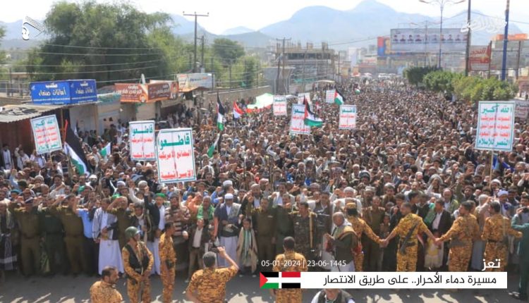 احتشد أبناء محافظة تعز عقب صلاة الجمعة اليوم في جولة شارع الحوبان، في مسيرة “دماء الأحرار.. على طريق الانتصارات” تلبية لدعوة قائد الثورة عبدالملك بدر الدين الحوثي لنصرة الشعب الفلسطيني.