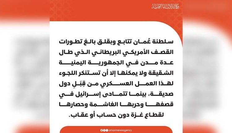 وقالت الوزارة في بيان لها اليوم الجمعة: “تتابع سلطنة عُمان وبقلق بالغ تطورات القصف الأمريكي البريطاني الذي طال عِدة مدن في الجمهورية اليمنية الشقيقة ولا يمكنها إلا أن تستنكر اللجوء لهذا العمل العسكري من قِبَلِ دول صديقة، بينما تتمادى “إسرائيل” في قصفها وحربها الغاشمة وحصارها لقطاع غزة دون حساب أو عقاب”.