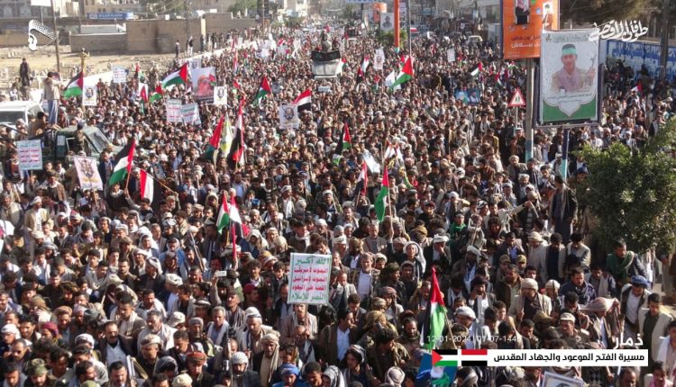 مسيرة جماهيرية حاشدة في ذمار تنديداً بالعدوان الأمريكي البريطاني وإعلاناً للجهوزية والنفير العام