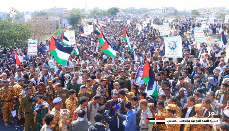 وخرج أبناء محافظة تعز عقب أداء صلاة جمعة رجب من جامع الجند التاريخي باتجاه اللواء 22 في الجند بمسيرة حاشدة بعنوان “الفتح الموعود والجهاد المقدس” تأكيداً على الموقف المساند لغزة والداعم للشعب الفلسطيني ومقاومته الباسلة.