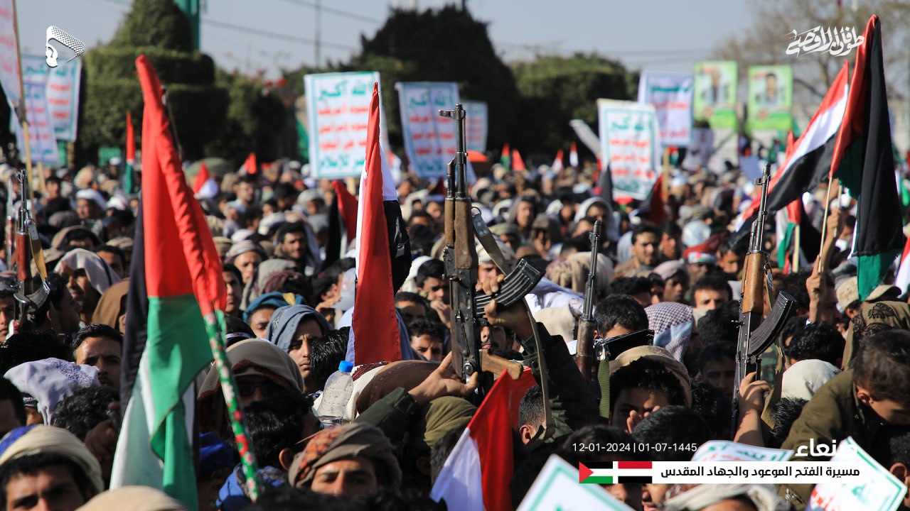 ورفعت الجماهير المحتشدة، العلمين اليمني والفلسطيني واللافتات والشعارات المؤيدة والمباركة للعمليات العسكرية البطولية التي تنفذها القوات المسلحة في القوات البحرية والصاروخية والطيران المسير للدفاع عن سيادة اليمن واستقلاله.