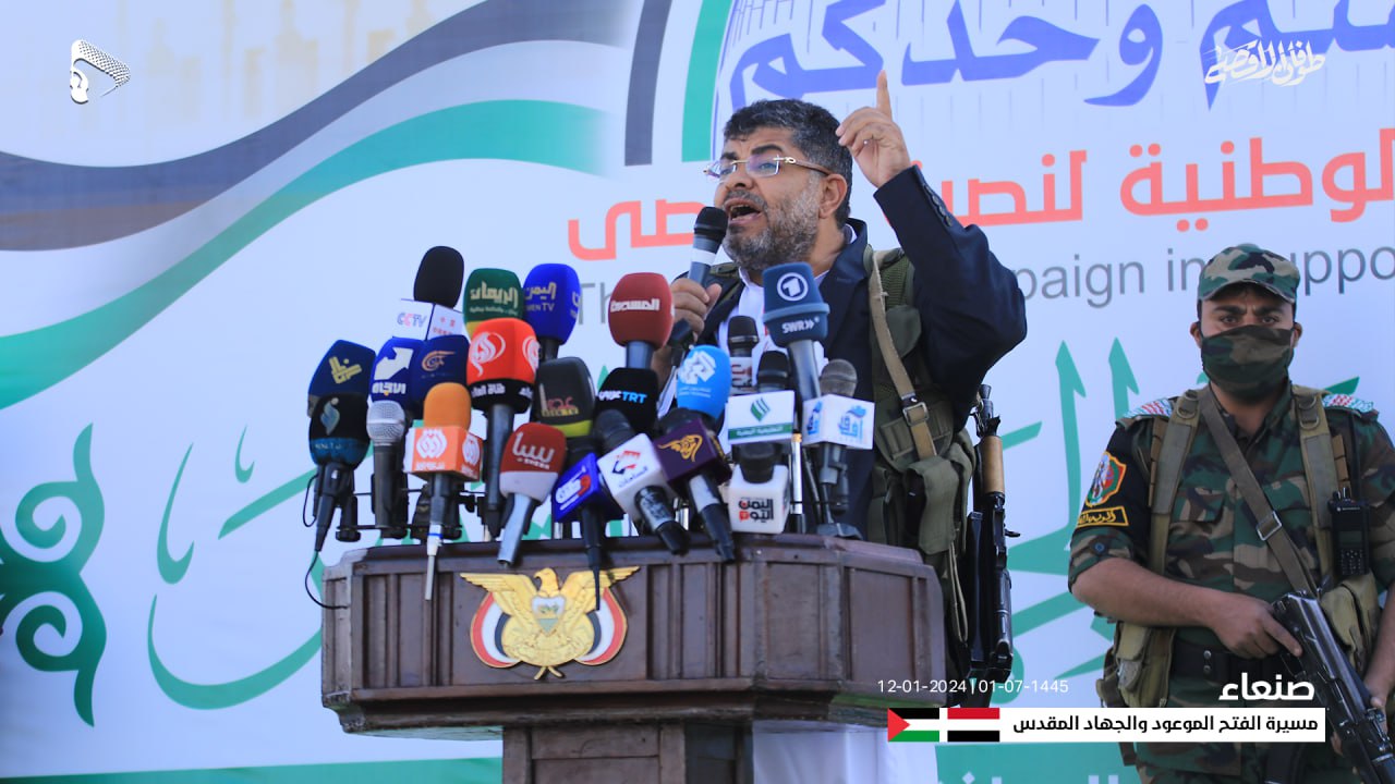 وأكد أن الضربات التي شنها الأمريكي والبريطاني على اليمن لن تنل من معنويات وقوة الشعب اليمني.. وقال “لقد كان البريطاني وهو بكامل قوته بينما كان شعبنا لا يحمل سوى البندقية ولا يملك التكنولوجيا التي تمتلكها القوات المسلحة، أما اليوم فاهي الساحة ترفع شعارها وبنادقها وتقول الموت لأمريكا الموت لإسرائيل اللعنة على اليهود النصر للإسلام.