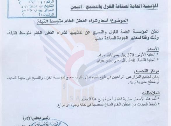 ودعت جميع المزارعين الراغبين في بيع القطن التوجه إلى أقرب محلج تابع للمؤسسة في مدينة الحديدة أو مديرية زبيد، لافتة إلى أن هذه التسعيرة سارية المفعول من تاريخ إعلان بيان المؤسسة.