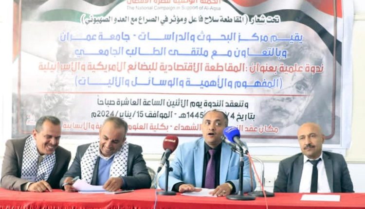 نظم مركز البحوث والدراسات بجامعة عمران اليوم، ندوة علمية بعنوان “المقاطعة الاقتصادية للبضائع الأمريكية والإسرائيلية .. المفهوم والأهمية والوسائل والآليات”.
