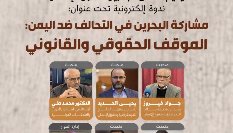 نظّم منتدى البحرين لحقوق الإنسان في بيروت اليوم الأربعاء، ندوة إلكترونية تحت عنوان (مشاركة البحرين في التحالف ضد اليمن: الموقف الحقوقي والقانوني).