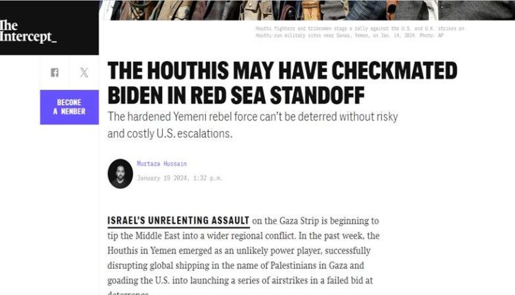 نشر موقع “ذا إنترسبت” تقريرًا جاء فيه أنّ: “جماعة أنصار الله اليمنية تجرّ الولايات المتحدة إلى سلسلة من الضربات الجوية في محاولة فاشلة للردع”.