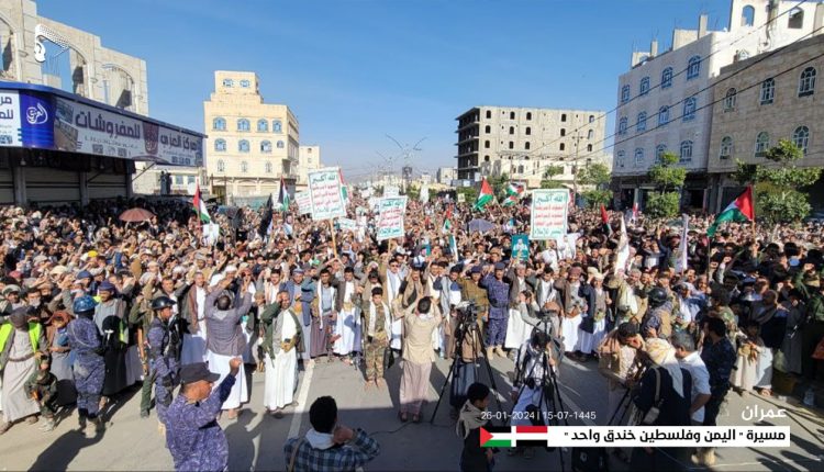 احتشد أبناء محافظة عمران في ثلاث مسيرات حاشدة لتعزيز موقف التضامن مع الشعب الفلسطيني، وإعلان النفير العام لمواجهة العدوان الأمريكي – البريطاني، تحت شعار “اليمن وفلسطين خندق واحد”.