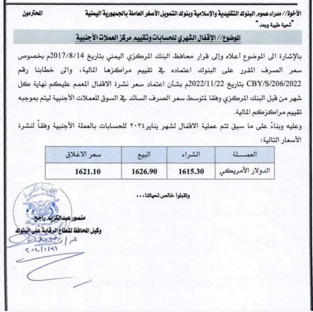 وأصدرت النقابة بياناً قالت فيه إنه بينما كان سعر الصرف الريال السعودي 427 مقابل الريال اليمني أمس الأربعاء 31 يناير 2024، وكان متهيئًا للنزول التدريجي، قام وكيل محافظ البنك المركزي اليمني لقطاع الرقابة على البنوك منصور راجح، بنشر تعميم للبنوك لنشرة الإغلاق لشهر يناير بسعر أعلى من سعر السوق المصرفي.