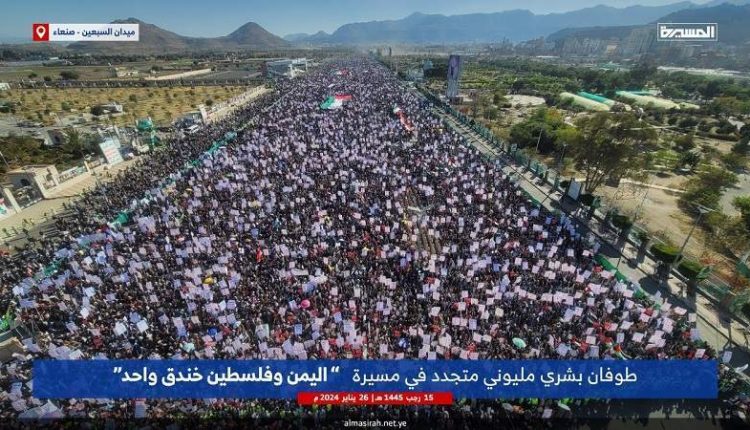 يستمر اليمانيون في الخروج المليوني يوم الجمعة من كل أسبوع بالعاصمة اليمنية صنعاء وعموم المحافظات تنفيذاً لتوجيهات السيد القائد عبد الملك بدر الدين الحوثي- يحفظه الله- نصرة لسكان غزة الذين يتعرضون لحرب إبادة جماعية من قبل كيان العدو الصهيوني على مدى أكثر من 4 أشهر.