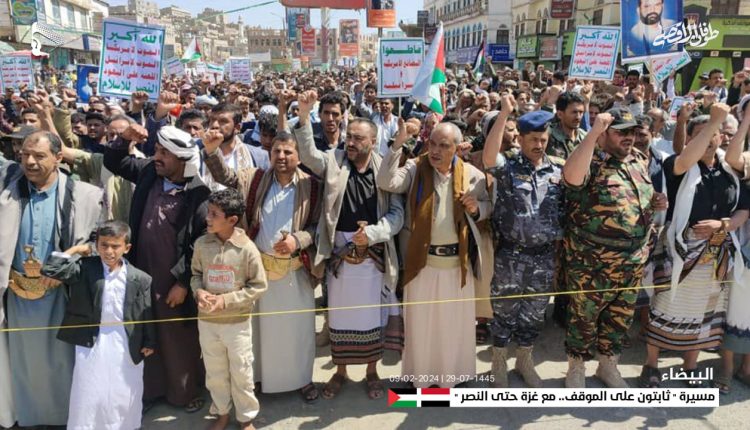 وندد المشاركون، في المسيرة التي تقدمتها القيادات المحلية والتنفيذية وعلماء وشخصيات اجتماعية، باستمرار العدوان الأمريكي – البريطاني على اليمن، مؤكدين ثبات الموقف المساند للشعب الفلسطيني والمقاومة الباسلة في غزة، وأن الشعب الفلسطيني ليس وحده في معركة الجهاد المقدس ضد العدو الصهيوني المدعوم أمريكيا وأوروبيا.
