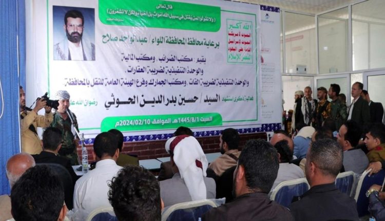 نظم مكاتب الضرائب والمالية والوحدة التنفيذية لضريبية القات والوحدة التنفيذية لريع العقارات والجمارك والهيئة العامة للنقل البري بمحافظة إب اليوم فعالية خطابية بالذكرى السنوية للشهيد القائد السيد حسين بدرالدين الحوثي.