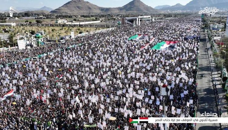 ويخرج الشعب اليمني في مسيرات مليونية يوم الجمعة من كل أسبوع، معلنين وقوفهم ومساندتهم للشعب الفلسطيني، ومنددين بالجرائم المتوحشة للكيان الصهيوني في قطاع غزة، وهو خروج لا مثيل له في بقية دول العالم، ويحركه السيد القائد عبد الملك بدر الدين الحوثي – يحفظه الله.