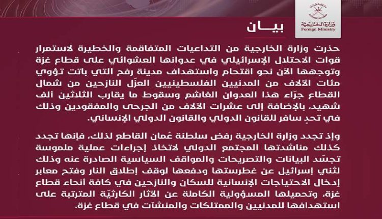 الخارجية العمانية تحذر من التداعيات الخطيرة لتوجه قوات العدو لاقتحام رفح