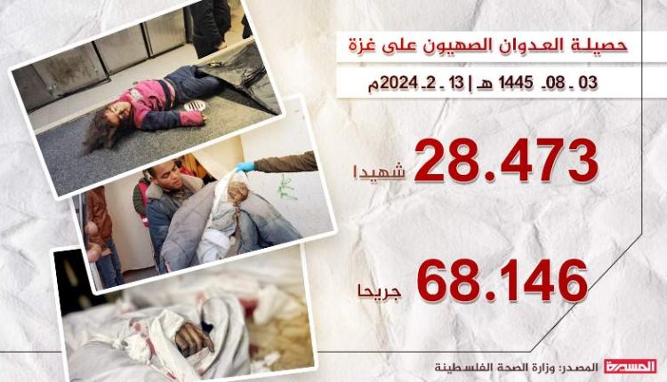 وأكدت الوزارة ارتفاع حصيلة العدوان الصهيوني على القطاع المحاصر إلى 28.473 شهيدا و 68.146 مصابا منذ السابع من أكتوبر الماضي.