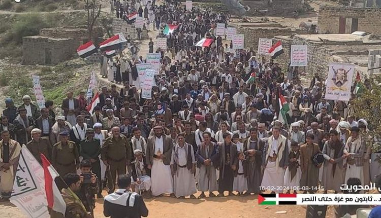 شهدت مديريات محافظة المحويت، اليوم، مسيرة حاشدة تحت شعار ” ساحاتنا جهاد .. ثابتون مع غزة حتى النصر” نصرة لغزة وتنديداً بالمجازر الوحشية التي يرتكبها الاحتلال الإسرائيلي في قطاع غزة