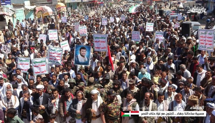 شهدت البيضاء اليوم مسيرة جماهيرية حاشدة مناصرة للقضية الفلسطينية وتنديداً بجرائم العدو الصهيوني في غزة والأراضي المحتلة وتحدياً للعدوان الأمريكي – البريطاني على اليمن تحت شعار “ساحتنا جهاد .. ثابتون مع غزة حتى النصر”.