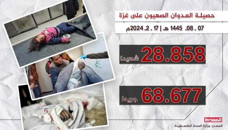 وأكدت الوزارة ارتفاع عدد ضحايا العدوان الصهيوني المتواصل على غزة منذ السابع من أكتوبر الفائت إلى 28.858 شهيدا و 68.677 مصابا.
